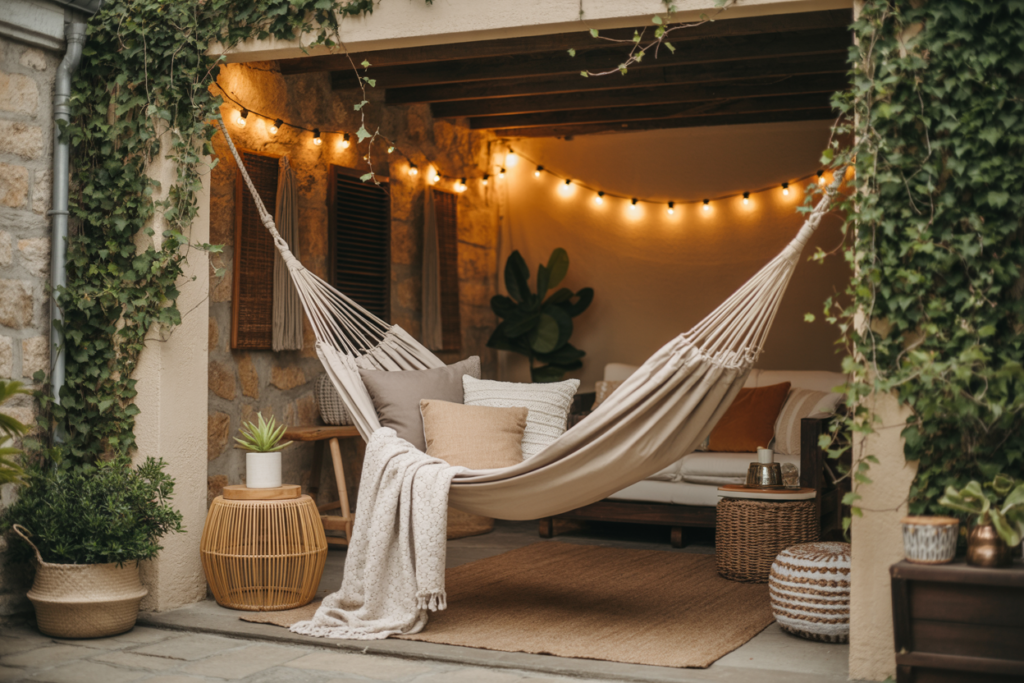 The hanging chair or hammock. This is the piece that makes a boho patio feel like itself more than almost anything else. A rattan hanging egg chair suspended from a sturdy frame. A macramé hammock chair between two trees or on a porch beam. A classic rope hammock strung low between two posts. There is something about suspended seating — the gentle sway, the way it holds you rather than just supporting you — that is uniquely restoring for a body and mind that carries a lot. It belongs in this space.